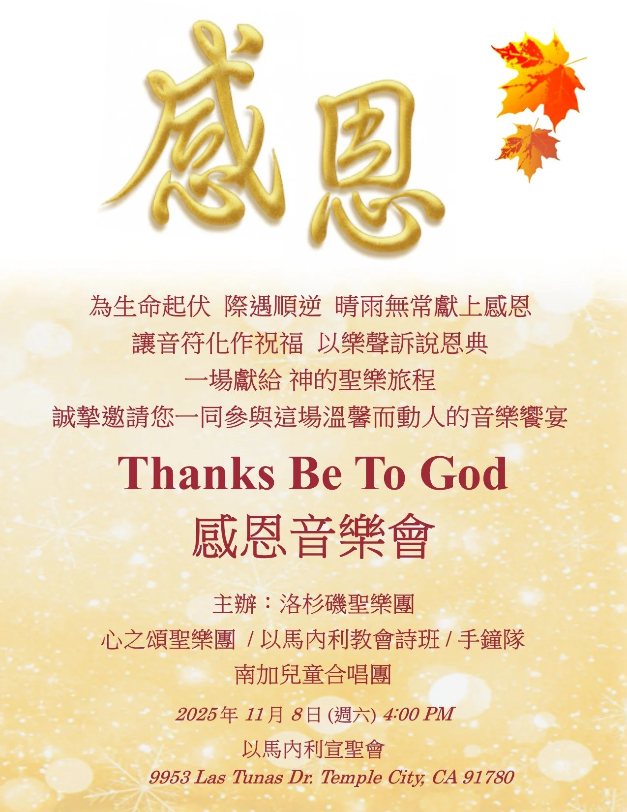 簡介:洛杉磯聖樂團將於當晚獻詩,以詩歌敬拜帶領會眾同心讚美神,誠摯邀請您一同參加!